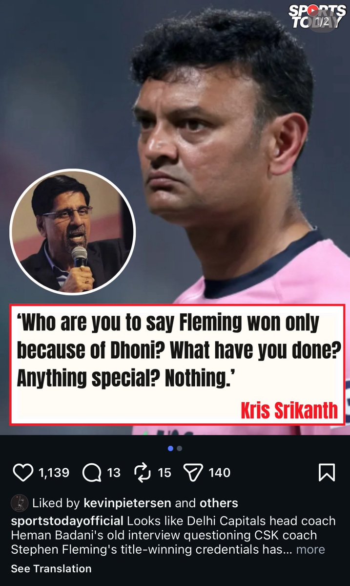 इंस्टाग्राम हैंडल sportstodayofficial के एक सोशल मीडिया पोस्ट में, IPL 2026 में स्टीफन फ्लेमिंग पर हेमांग बदानी की टिप्पणी के बाद कृष्णमाचारी श्रीकांत द्वारा बदानी की आलोचना को दर्शाया गया है।