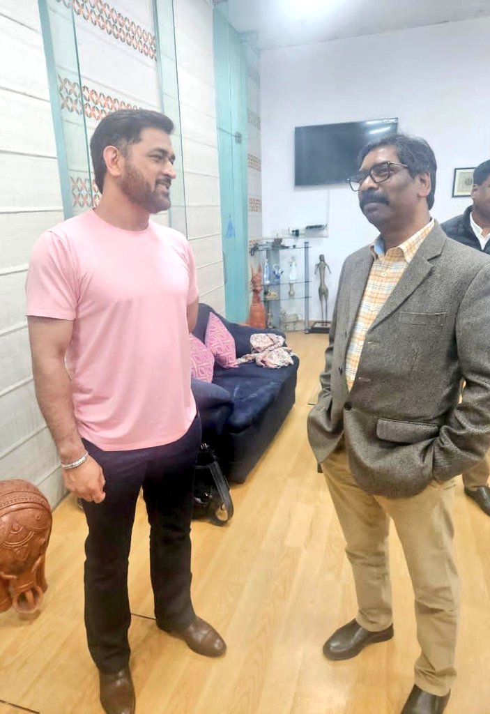 एमएस धोनी ने गुरुवार, 29 जनवरी को रांची में झारखंड के मुख्यमंत्री हेमंत सोरेन से मुलाकात की। झारखंड के इस राजनेता ने पूर्व भारतीय कप्तान और CSK के दिग्गज क्रिकेटर के साथ हुई अपनी बातचीत की तस्वीरें भी साझा कीं।