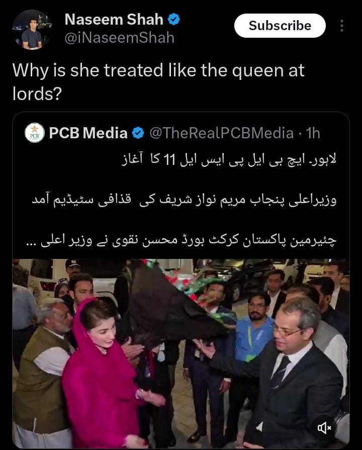 PCB द्वारा पंजाब की मुख्यमंत्री मरियम नवाज़ का वीडियो पोस्ट करने के बाद, नसीम शाह ने अपने X (जिसे पहले ट्विटर कहा जाता था) हैंडल पर बोर्ड की आलोचना करते हुए कहा कि पाकिस्तान में चल रहे संकट के माहौल के बीच VIP और उनके परिवार को विशेष ट्रीटमेंट दिया जा रहा है, जिसके कारण प्रशंसक स्टेडियम से PSL 2026 नहीं देख पाएंगे।