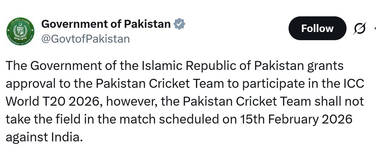 पाकिस्तान सरकार ने आगामी 2026 ICC मेन्स T20 विश्व कप में पाकिस्तान क्रिकेट टीम को भारत और श्रीलंका में भाग लेने की अनुमति दे दी है। हालांकि, दोनों देशों के बीच मौजूदा भू-राजनीतिक तनाव के मद्देनज़र, 'मेन इन ग्रीन' को ग्रुप A में अपने कट्टर प्रतिद्वंद्वी भारत के ख़िलाफ़ खेलने से रोक दिया गया है।