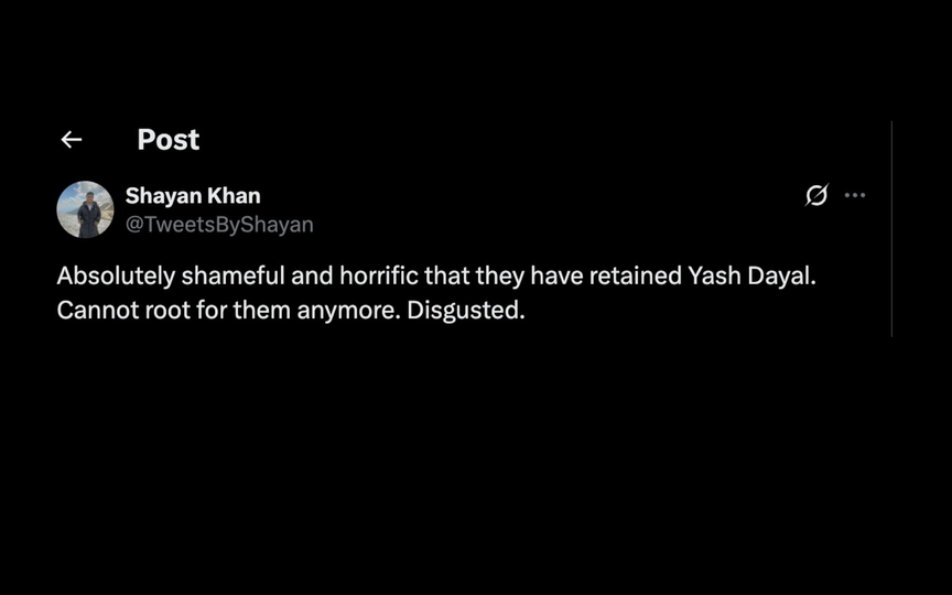 "यह बेहद शर्मनाक और भयावह है कि उन्होंने यश दयाल को बरक़रार रखा है। अब मैं उनका समर्थन नहीं कर सकता। घृणास्पद।"
