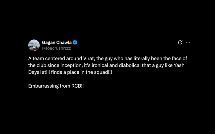 "एक टीम जिसका केंद्र विराट है, वह व्यक्ति जो शुरू से ही क्लब का चेहरा रहा है, यह विडंबनापूर्ण और शैतानी है कि यश दयाल जैसे व्यक्ति को अभी भी टीम में जगह मिलती है!!! RCB के लिए शर्मनाक!!"