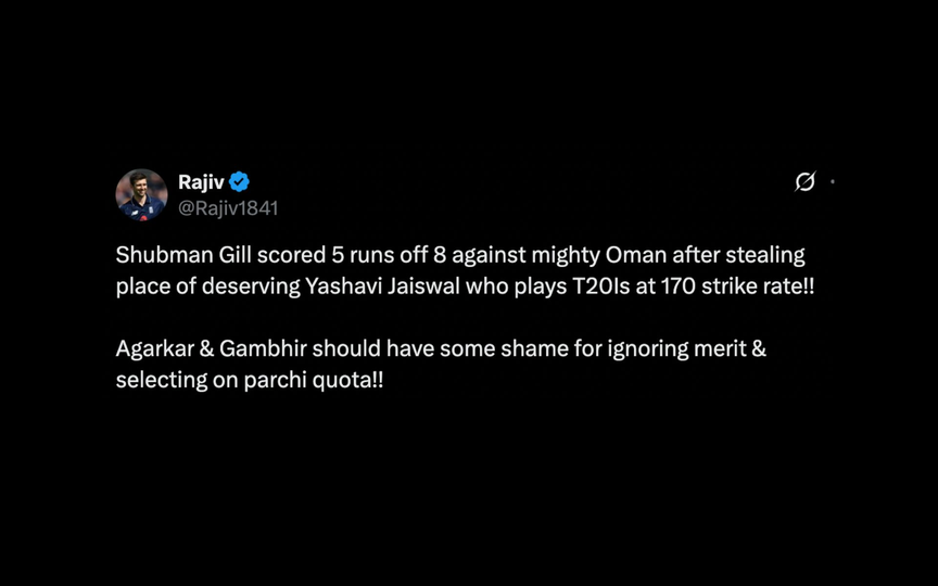 "शुभमन गिल ने ओमान के ख़िलाफ़ 8 गेंदों पर 5 रन बनाए, इसके बाद उन्होंने 170 के स्ट्राइक रेट से T20 खेलने वाले योग्य यशवी जायसवाल की जगह ले ली!! अगरकर और गंभीर को योग्यता को नज़रअंदाज़ करने और पर्ची कोटे पर चयन करने के लिए कुछ शर्म आनी चाहिए!!"