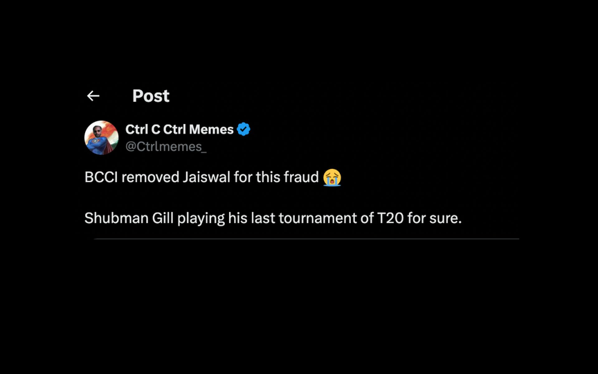 "बीसीसीआई ने इस धोखाधड़ी के लिए जयसवाल को हटा दिया 😭 शुभमन गिल निश्चित रूप से अपना आखिरी टी20 टूर्नामेंट खेलेंगे।"